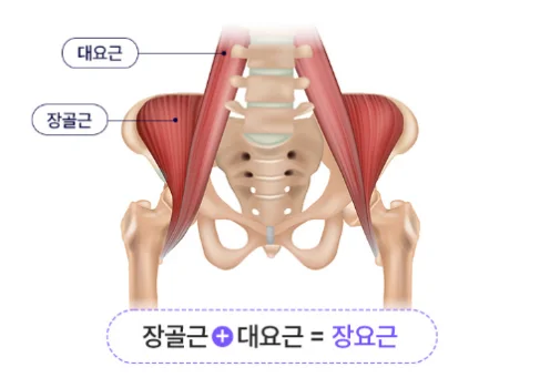 장요근(iliopsoas)은 대요근과 장골근으로 이루어진 근육으로, 흉추, 요추, 장골, 천골에서부터 대퇴골 소전자까지 이어지는 우리 몸의 중심에 위치한 코어 근육이에요.